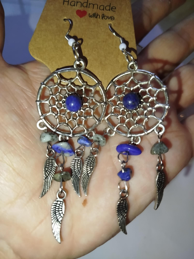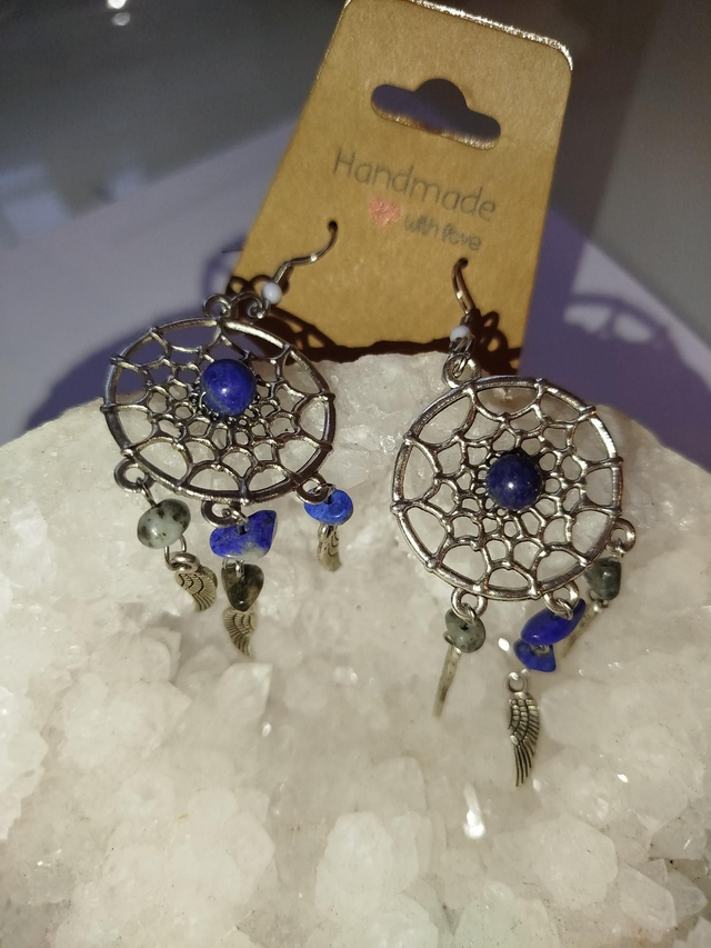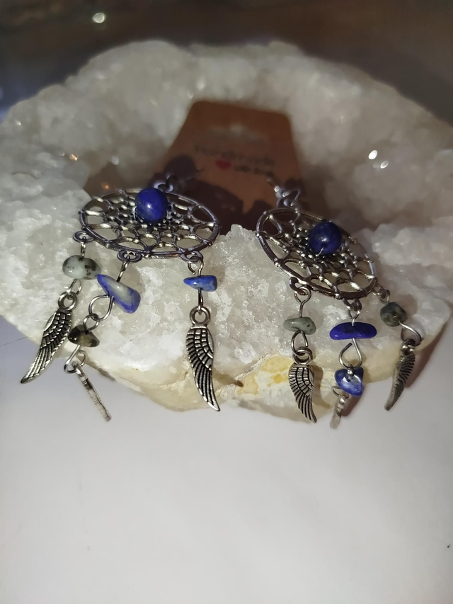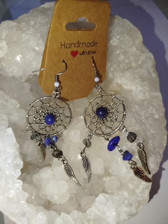 Boucles d’oreilles pendantes, ornées de pendentifs inspirés des attrape-rêves.
