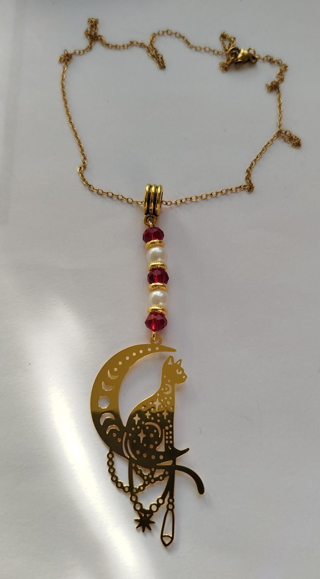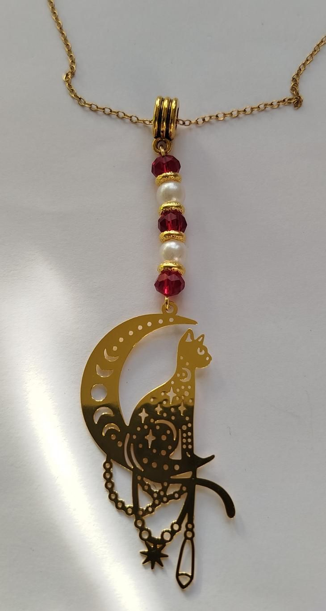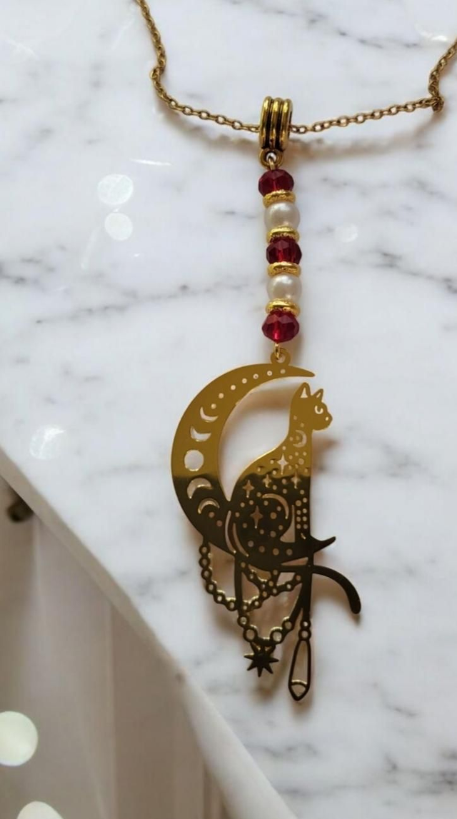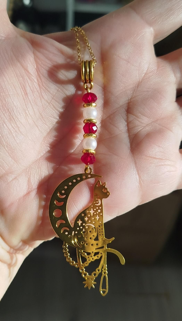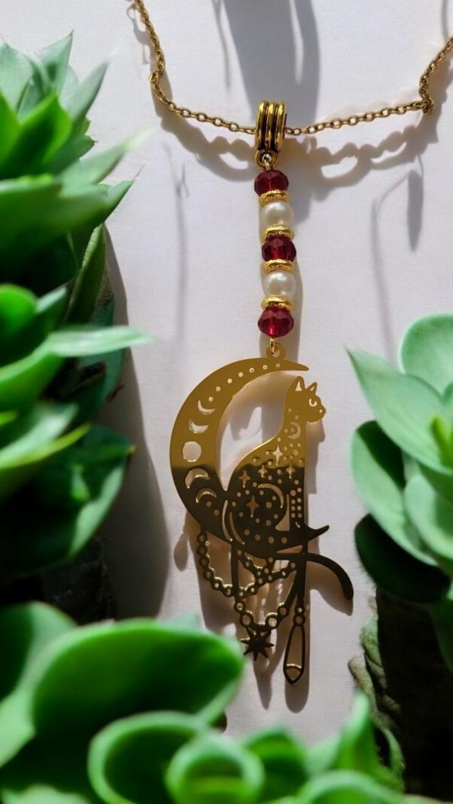 ✨ Un pendentif doré finement ajouré représentant un chat perché sur un croissant de lune, orné de perles nacrées et rouges étincelantes.