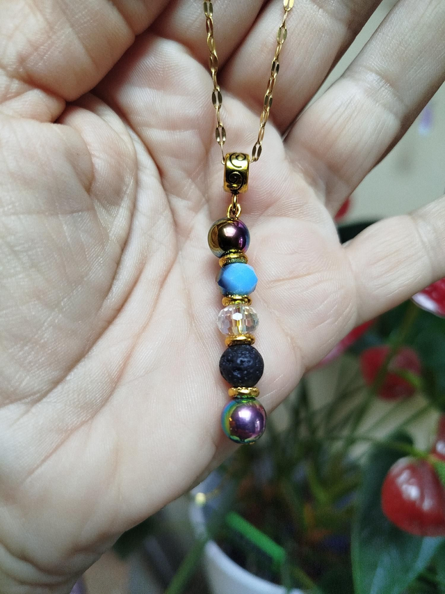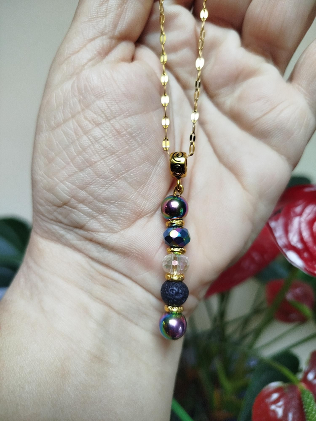 Alliance de la matière et de la lumière : lave noire, cristal et reflets métalliques sur chaîne dorée.