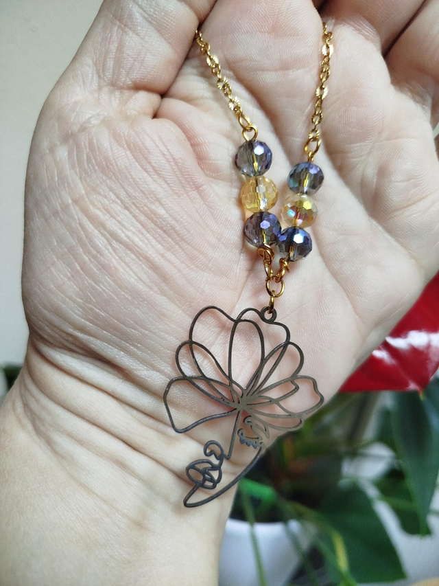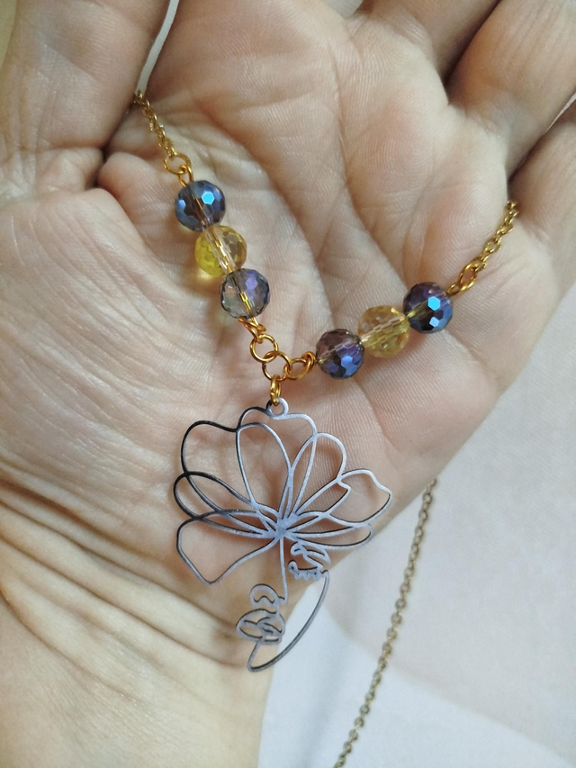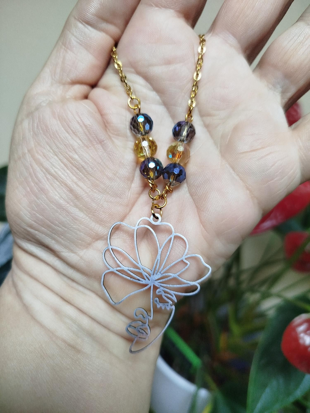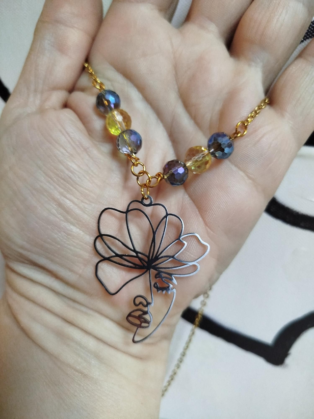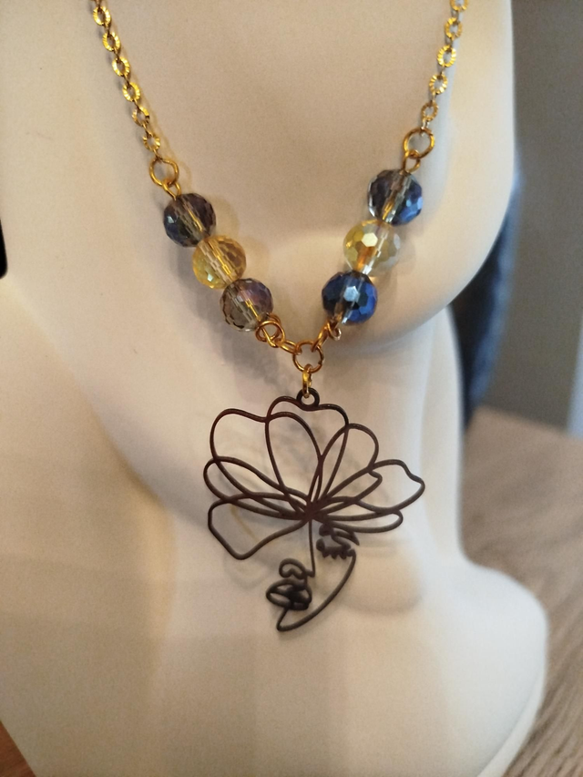 Alliance douce du bleu et de l’or : un visage stylisé fleuri suspendu à une chaîne dorée. Un bijou rayonnant, poétique et moderne.