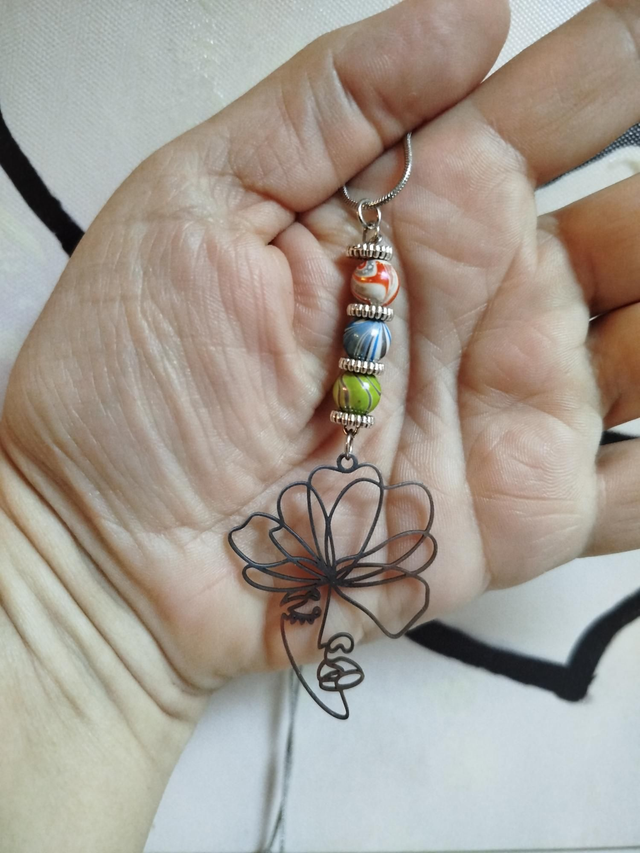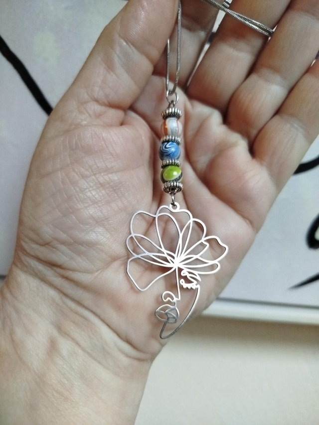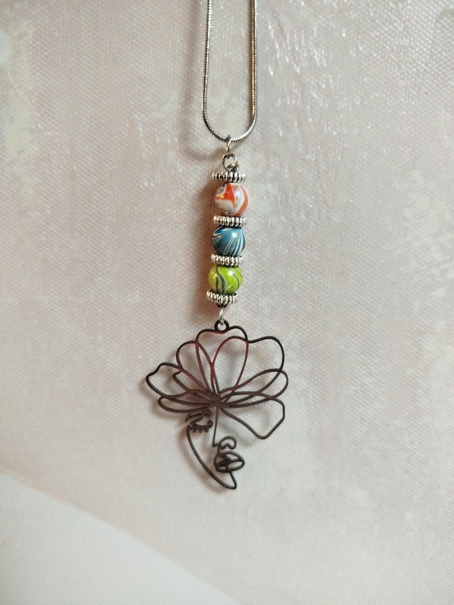 Visage stylisé argenté et perles aux reflets multicolores. Un bijou libre et aérien, entre douceur et personnalité.