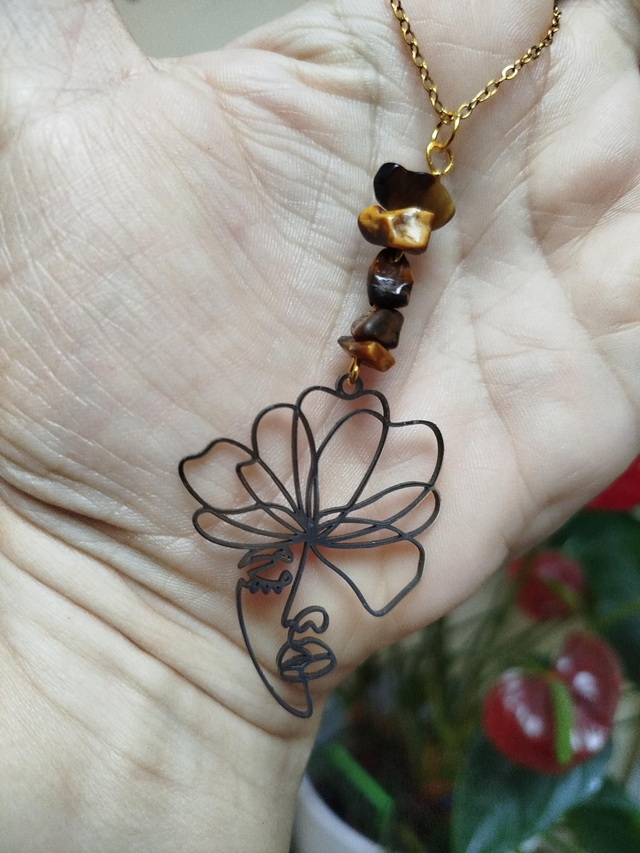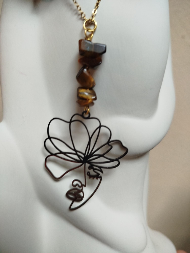 Visage stylisé gris surmonté de pierres Oeil de tigre, portées sur une chaîne dorée.