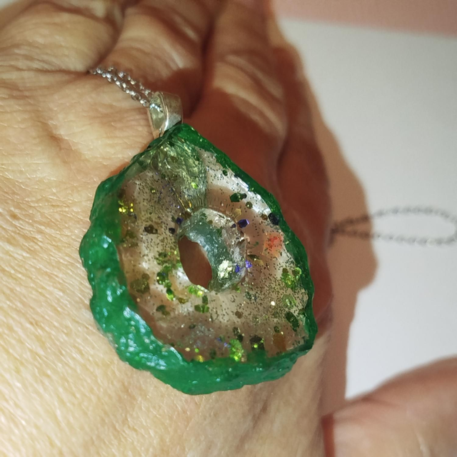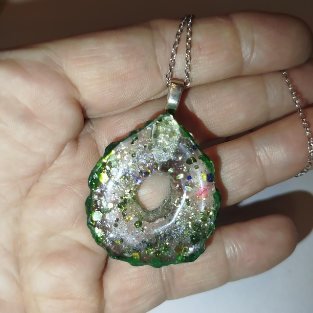 Pendentif en résine transparente percé au centre, parsemé de fines paillettes et bordé d’un vert foncé lumineux.