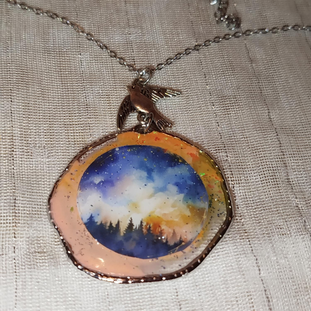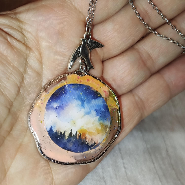 Collier orné d’un pendentif rond en résine, à la forme légèrement irrégulière, mettant en scène un paysage délicat. Des sapins se dessinent sous un ciel aux nuances de bleu, de jaune et de rose orangé, créant une atmosphère douce et lumineuse.