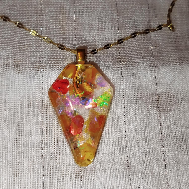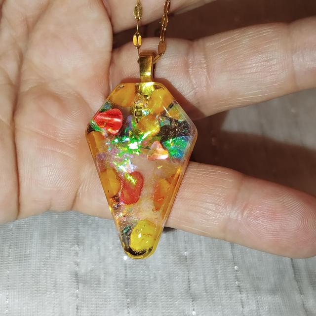 Pendentif en résine transparente renfermant de délicates pierres jaunes, rehaussées d’une touche rouge et de fines paillettes iridescentes. Les reflets lumineux se mêlent à la clarté de la résine pour un rendu éclatant.