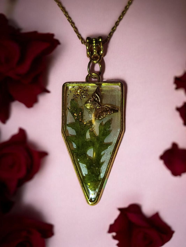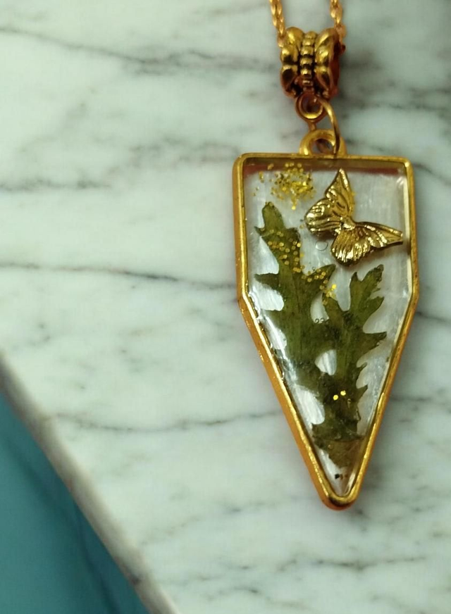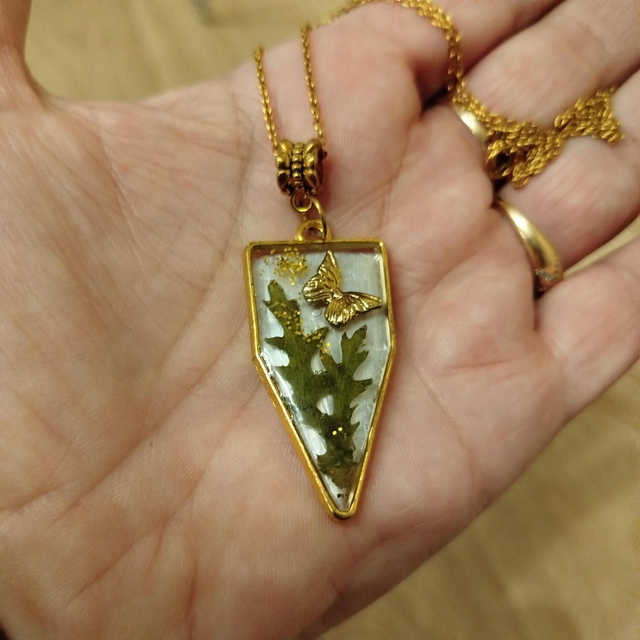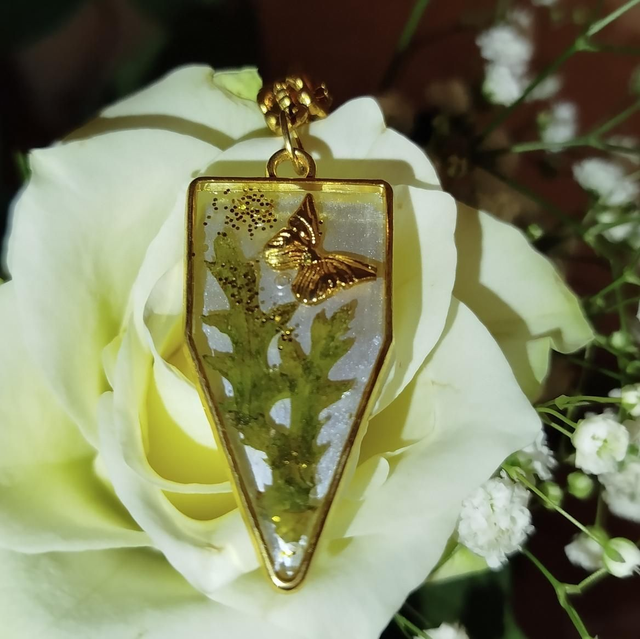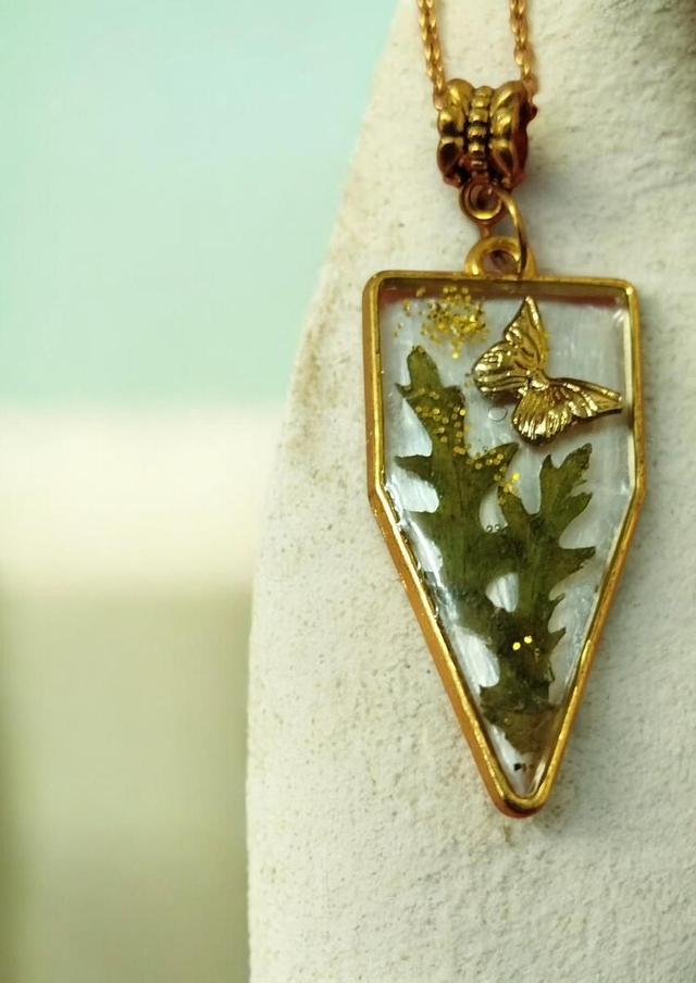 Collier raffiné composé d’un pendentif en résine transparente, sur un fond peint en gris, mettant en valeur un petit papillon doré et un fragment de végétal séché, délicatement saupoudré de paillettes dorées.