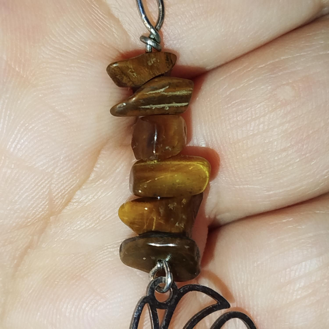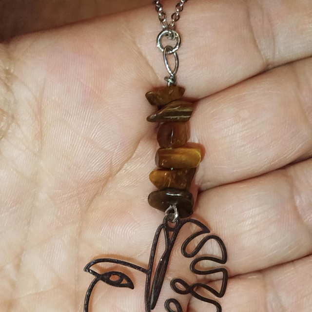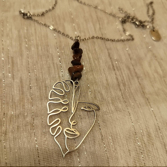 Collier composé d’un pendentif représentant un visage stylisé, surmonté de pierres œil de tigre aux reflets chaleureux.