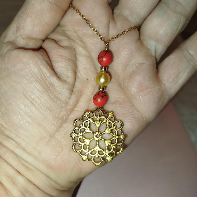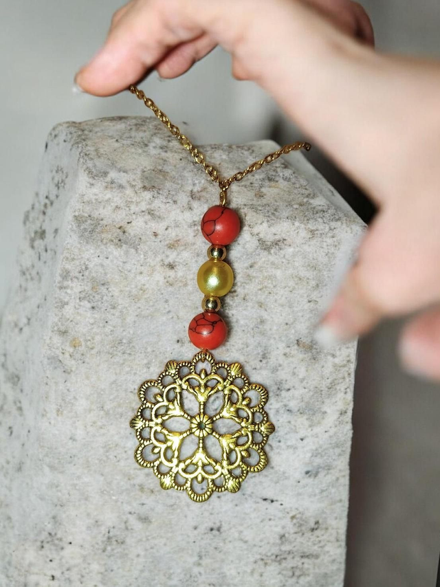 Sous ces perles, une délicate rosace dorée apporte une touche précieuse et raffinée.
